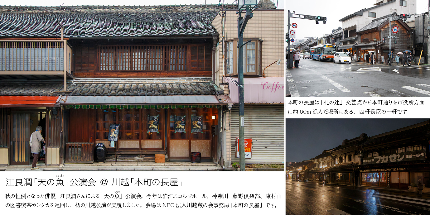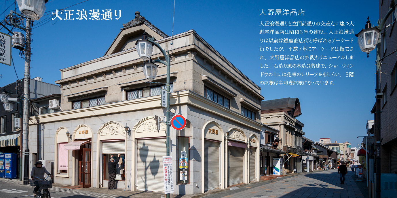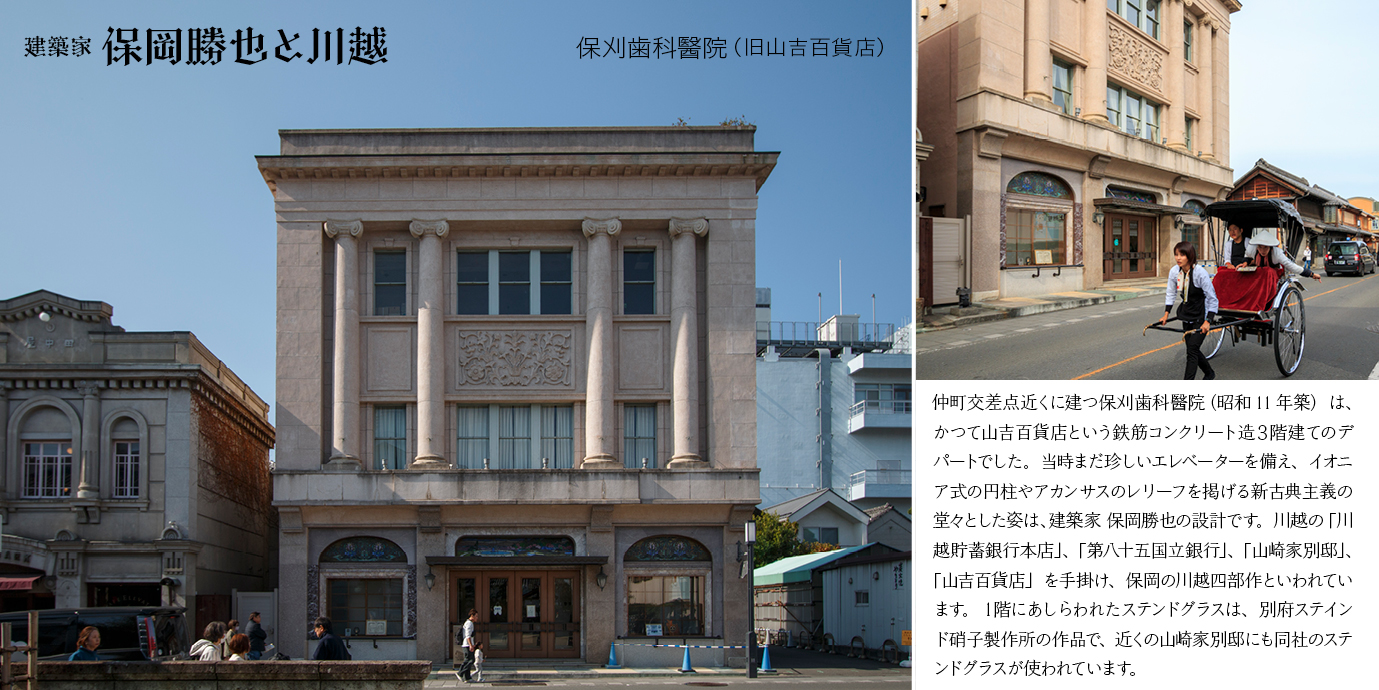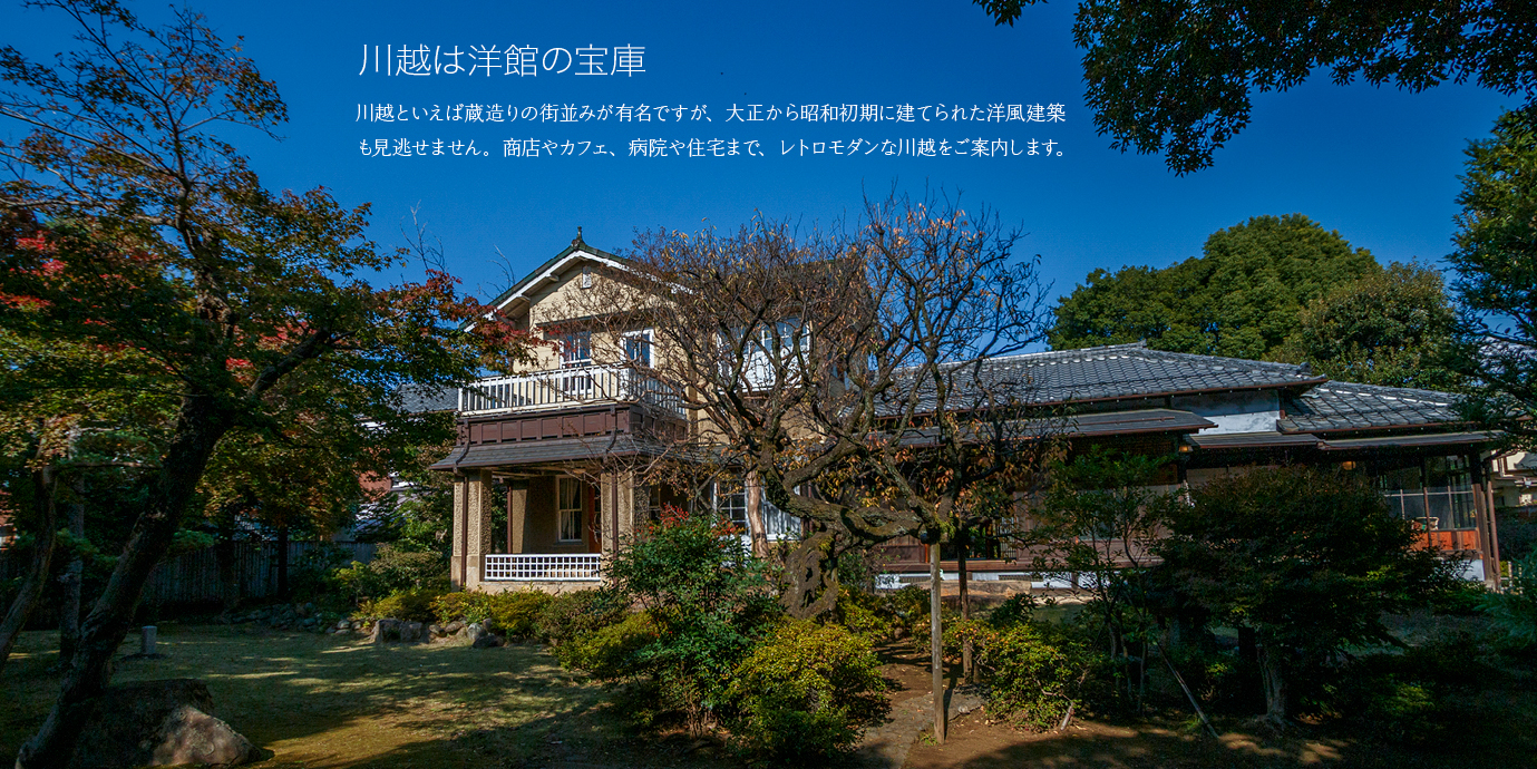 小江戸モダニズム川越 時空を超える美意識 https://collaj.jp/枯露柿 2025 川越は洋館の宝庫 川越といえば蔵造りの街並みが有名ですが、大正から昭和初期に建てられた洋風建築も見逃せません。商店やカフェ、病院や住宅まで、レトロモダンな川越をご案内します。 大正浪漫通り 大野屋洋品店 大正浪漫通りと立門前通りの交差点に建つ大野屋洋品店は昭和5年の建設。大正浪漫通りは以前は銀座商店街と呼ばれるアーケード街でしたが、平成7年にアーケードは撤去され、大野屋洋品店の外観もリニューアルしました。石造り風の木造3階建で、ショーウィンドウの上には花束のレリーフをあしらい、3階の屋根は半切妻屋根になっています。 大正浪漫通りの「シマノコーヒー大正館」は、昭和8年築の木造2階建で、もとは呉服店でした。軒下には歯のように並んだ「デンティル」と呼ばれる飾りがあり、2階部分にはドリス式の飾り柱と三連のアーチ窓を配しています。19世紀はじめヨーロッパで流行した新古典主義の影響が見られます。三連アーチ窓やスワッグなどのモチーフは他の洋館風店舗にもよく見られ、異なる建て主・大工たちが同じモチーフを扱った所が面白いです。 大正浪漫通りの伊勢亀本店は 3代続く洋品店で、大正3年築。左隣の「カニヤ」は明治から続く眼鏡店です。通りに並ぶ洋風建築は、ファサードだけを洋風に仕立てた看板建築で、その奥には瓦葺きの日本家屋がつながります。右隣の「小川菊(おがぎく)」は、文化 4年(1807)創業のうなぎの名店として知られ、大正初期に建てられた店舗は川越では珍しい木造 3階建です。明治元年創業の酒店「伊勢源」との間に立ったレンガ壁には、火災の延焼を防ぐ役割があります。大正浪漫通りの入口にあたるT字路に、ドーリア式列柱を並べたギリシャ神殿を思わせる建物が見えます。昭和 2年武州銀行川越支店として建造された川越商工会議所です。設計者の前田健二郎は、武州銀行各支店のほか、高島屋日本橋店、京都市立美術館、銀座資生堂本社などの設計を手がけました。大阪市美術館、早稲田大学大隈記念大講堂、東京都慰霊堂、パリ万国博覧会日本館など数々の建築コンペで一等案をとったことで知られますが、設計者が変えられたり設計案を変更されたり不遇だったそうです。川越商工会議所の向かいには、橋本雅邦など山崎家の日本画コレクションを展示した「山崎美術館」があります。 街灯をともす月を星を雲がかくした暗い道をあなたの家まで Vol.77 原作:タカハシヨウイチ はら すみれ絵 : タカハシヨウイチ 大正2年に建てられた歯科医院兼住宅で、医院として110年以上の歴史をつないできました。建主は埼玉県歯科医師会会長を務めた目黒虎三郎氏。地元の棟梁印藤順蔵が建設を手掛けました。昭和6年、中野清氏に譲渡され、跡を継ぐはずだった中野克明氏が大学在学中に急逝したため、昭和 50年にいったん歯科医院の歴史を閉じます。平成 14年、孫の中野文夫氏によって最新の歯科医院にリニューアルされたそうです。建物はハーフティンバー様式、屋根は天然スレートで葺かれ、縦長窓は1階が左右開き、2階が上げ下げ窓となっています。 手打そば 百丈(旧湯宮釣具店)川越ホーム(旧オカダ洋服店) 川越市役所近くの「手打そば百丈」(昭和5年築)は、緑青色の銅板に覆われた元つり具店です。2階の窓はギリシャ風の付け柱を添えた重厚なデザインで、3階は半円をあしらったやや小ぶりの窓です。複雑な形状を銅板で張った当時の職人技が感じられます。一番街の「川越ホーム蔵のまちコンサルティングオフィス」は、路地の奥へとつづく五軒長屋です。昭和5年に渡辺家により建てられ、その後、様々な店舗として使われ建築当初の姿を失っていたところ、川越ホームの松ケ角紘一さんが購入し、建築士の守山登さんと共に古い写真や聞き込みによって当時の姿を調べ、セセッション風の長屋を復原し継承されました。 モダン亭 太陽軒 モダン亭 太陽軒は昭和4年築。セセッション風のデザインで、木造2階建の外壁は漆喰塗。窓にはステンドガラスを嵌め、角の入口の上にはギリシャ風円柱を立てています。店は大正11年の創業で、1階のアールデコ調大広間や大正浪漫を感じさせる2階個室など、創建当時の姿をよく残しています。太陽軒となりの「スカラ座」は、明治38年に開業した寄席「一力亭」がルーツです。昭和20年に現在の映画館へ転業。平成19年に休館しましたが、NPO法人プレイグラウンドにより運営が続けられています。川越では珍しいレンガづくりの建物は、大正10年竣工のプロテスタント教会「日本聖公会川越キリスト教会礼拝堂」です。設計は立教大学の礼拝堂で知られる米国の宣教建築家 ウィリアム・ウィルソン。四角い鐘楼を建てたチューダースタイルで、3つ並んだ礼拝堂正面の縦長窓は、三位一体を表すといわれます。フランス積みされたレンガは深谷の日本煉瓦製造製で、色ムラを組み合わせバランスをとっています。外壁に付随す